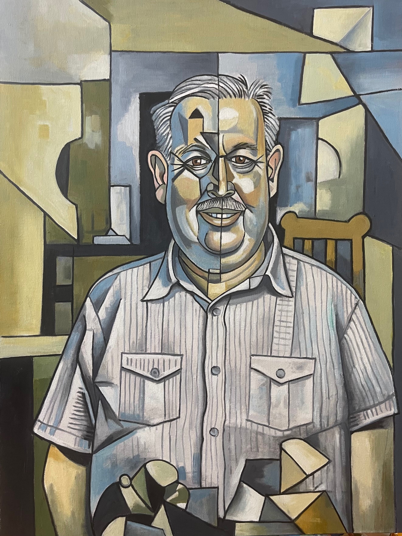 This image is of the artist Peter Segasby in a cubist-style portrait of a man with graying hair and a mustache. The painting utilizes geometric shapes and lines to construct the man’s face and body, with a clear division in the facial structure that emphasizes the cubist technique. He is wearing a striped shirt with pockets, and there are geometric shapes at the bottom of the painting, suggesting objects or a still life arrangement. The background is composed of abstract geometric forms in muted colors, typical of cubist art.